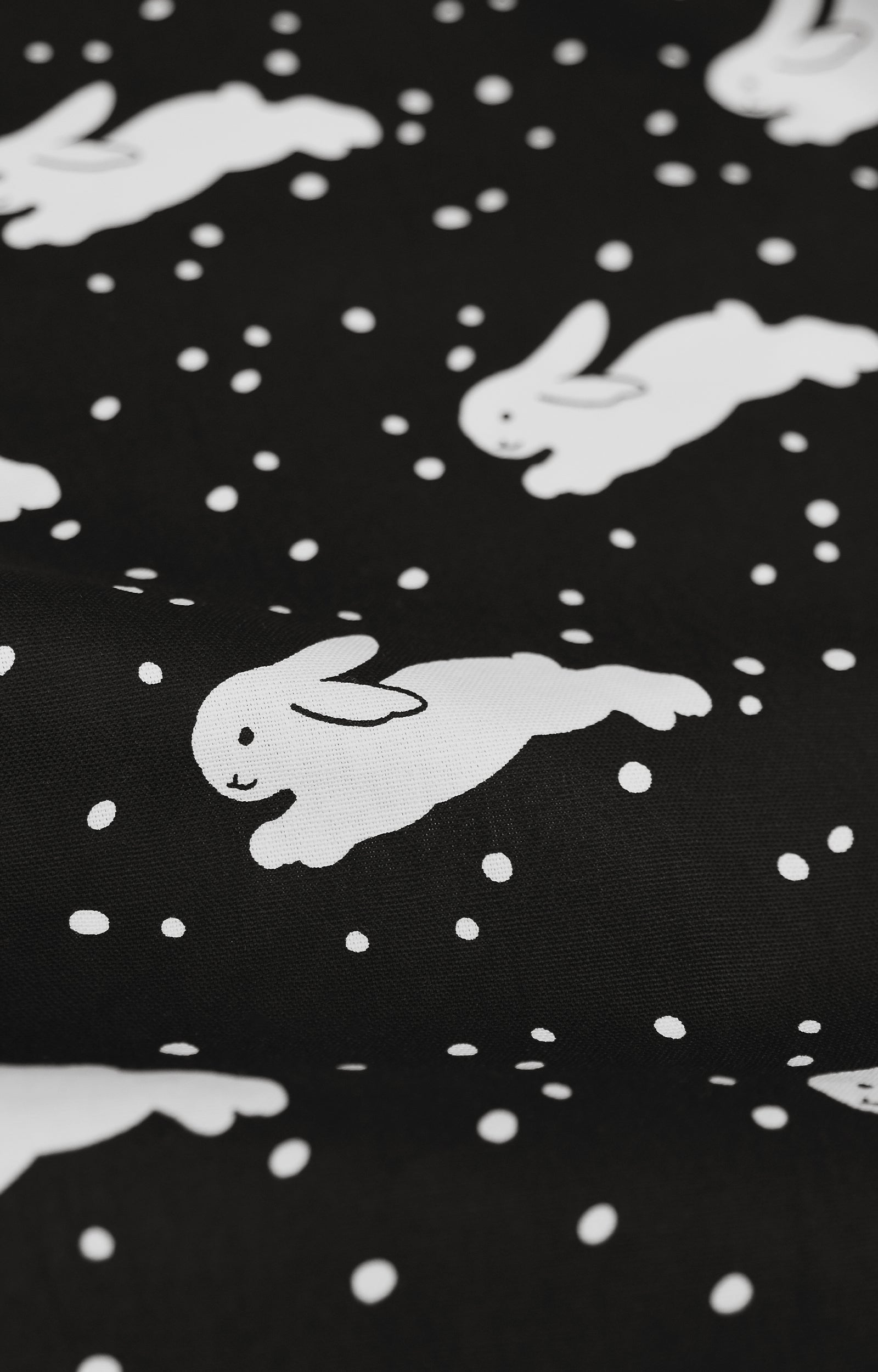 スノーバニーズ(Snow Bunnies)は、降りしきる雪の夜を背景に、軽やかに駆け回るうさぎたちの姿を描いたデザインです。落ち着いたモノトーンのコントラストの中に、静かな季節の美しさが感じられます。
